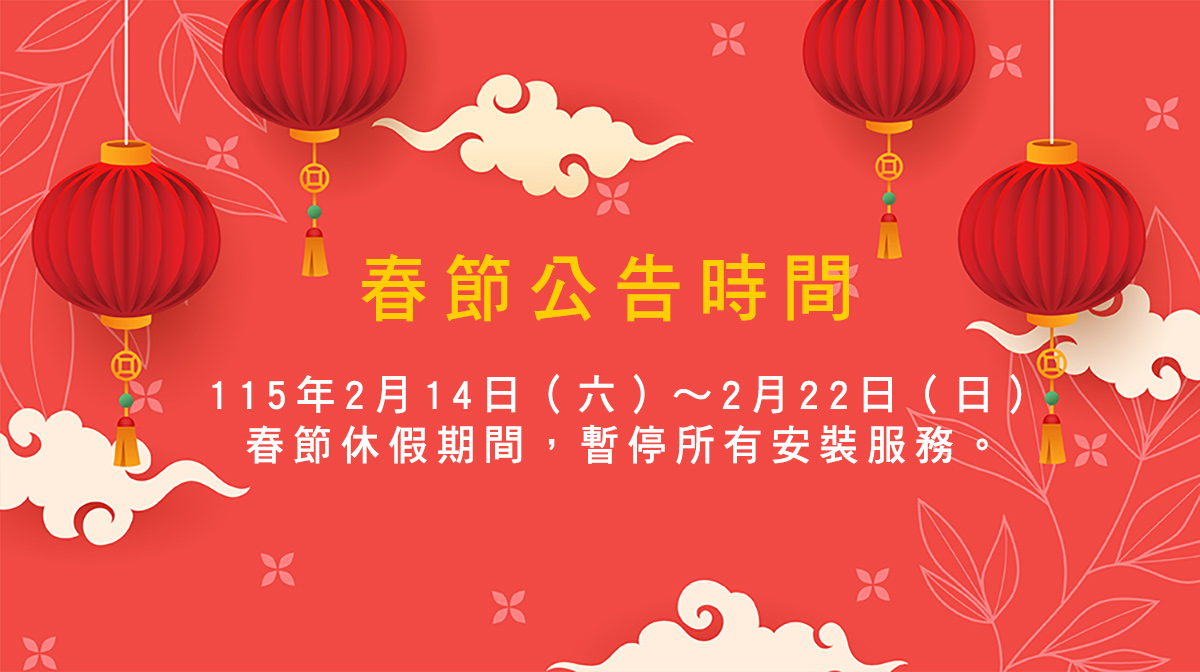 115年2月14日(六)~2月22日(日)春節休假期間,暫停所有安裝服務。